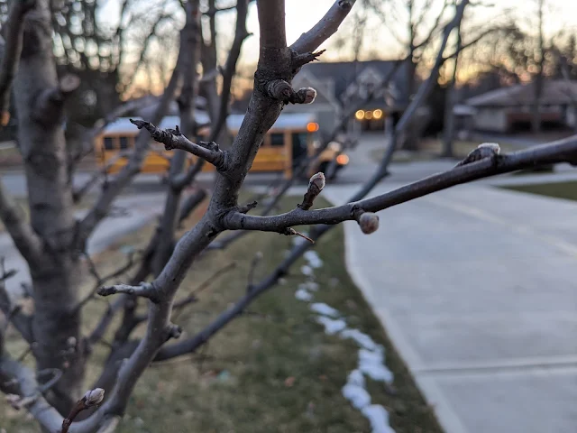 A couple of days ago, I posted a couple of photos of our Flowering Japanese Kwanzan Cherry Tree that had suffered a little bit of winter damage here on the blog. Today, I'm documenting a few of our front yard trees and their buds (or lack thereof). I wanted to capture a few of the trees and how their buds were coming along in the heart of Winter. If you're looking for a layout of our front yard trees that is a companion of this post, you can view it here on this 'tree dreaming' post from a week ago.