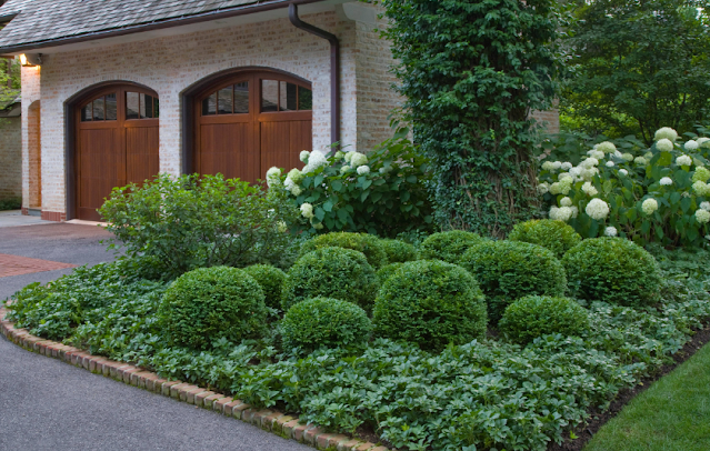 4. Without + 3 layers. Grasses in back, boxwoods planted via informal mass(es) all same variety + groundcover. (grasses in back, boxwoods bunched, groundcover). See below for one informal (not hard pruned to be same size) bed. The second photo shows another way to use different sizes, too.