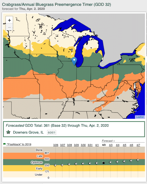 Nat added this bag that you see at the top of this post to one of her recent orders from Amazon.  It is a bag of Scott's Crabgrass and Grassy Weed Preventer under the "Halts" product name.  It does NOT have lawn food in it - which is fairly uncommon in most crabgrass preventers. You can find this stuff here at Amazon (this is NOT an affiliate link.  I don't do that...) for $16.99. I used this same product last year - and sought it out because of the fact that it doesn't have lawn food in the mix.  Last year, I held off on feeding my lawn until Memorial Day and I'm thinking that I'm going to do the same. I laid out my full 2020 lawn care plan here in this post from February .  In that post , you'll note that I'm calling for an application of this pre-emergent in "April" versus "mid-April".  And that's because that I'm going to turn to - once again - Michigan State University and their "Growing Degree Days...